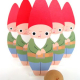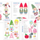 Included in the gnome inspired paper toys set is a paper doll, movable paper puppet, three finger puppets, a hanging mobile and a fun game of gnome bowling.
